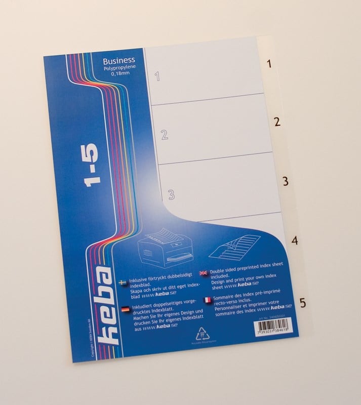 Plastregister i A4-format av mycket hög kvalitet. Helt transparent för ett stilrent och modernt intryck. Indexbladet är vändbart med extra mycket plats för text. Index 1-5.
