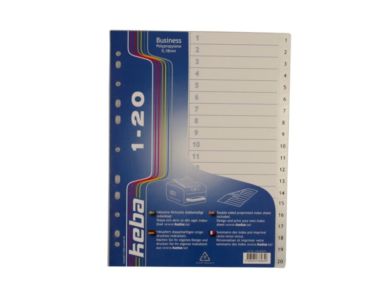 Plastregister i A4-format av mycket hög kvalitet. Helt transparent för ett stilrent och modernt intryck. Indexbladet är vändbart med extra mycket plats för text. Index 1-20.