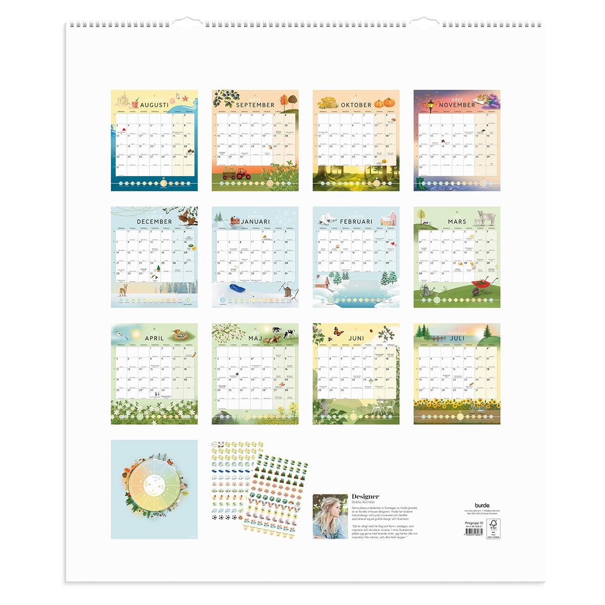 Burdes klassrumskalender är en väggkalender i stort format som är framtagen för att hänga i klassrummet. Varje sida är fylld av färg och säsongsrelaterade illustrationer, för att väcka nyfikenhet och förståelse kring årstiderna. Med kalendern följer en p