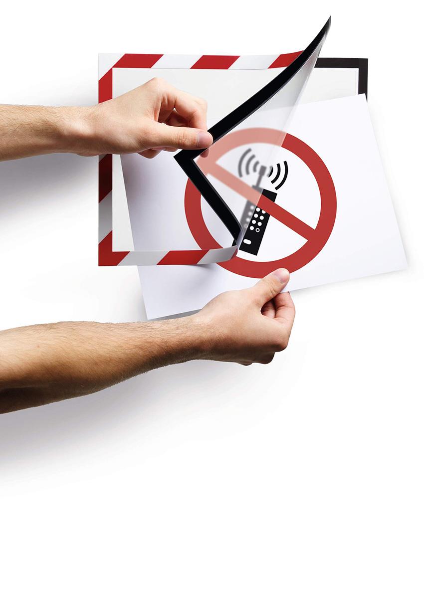 Inforam Duraframe Självhäftande Security Röd/Vit A4. Visa säkerhetsinformation snabbt och snyggt med DURAFRAME® SECURITY. Självhäftande ram för A4-dokument, enkel att montera utan verktyg. Magnetstängning håller inlagan säkert på plats – både stående och