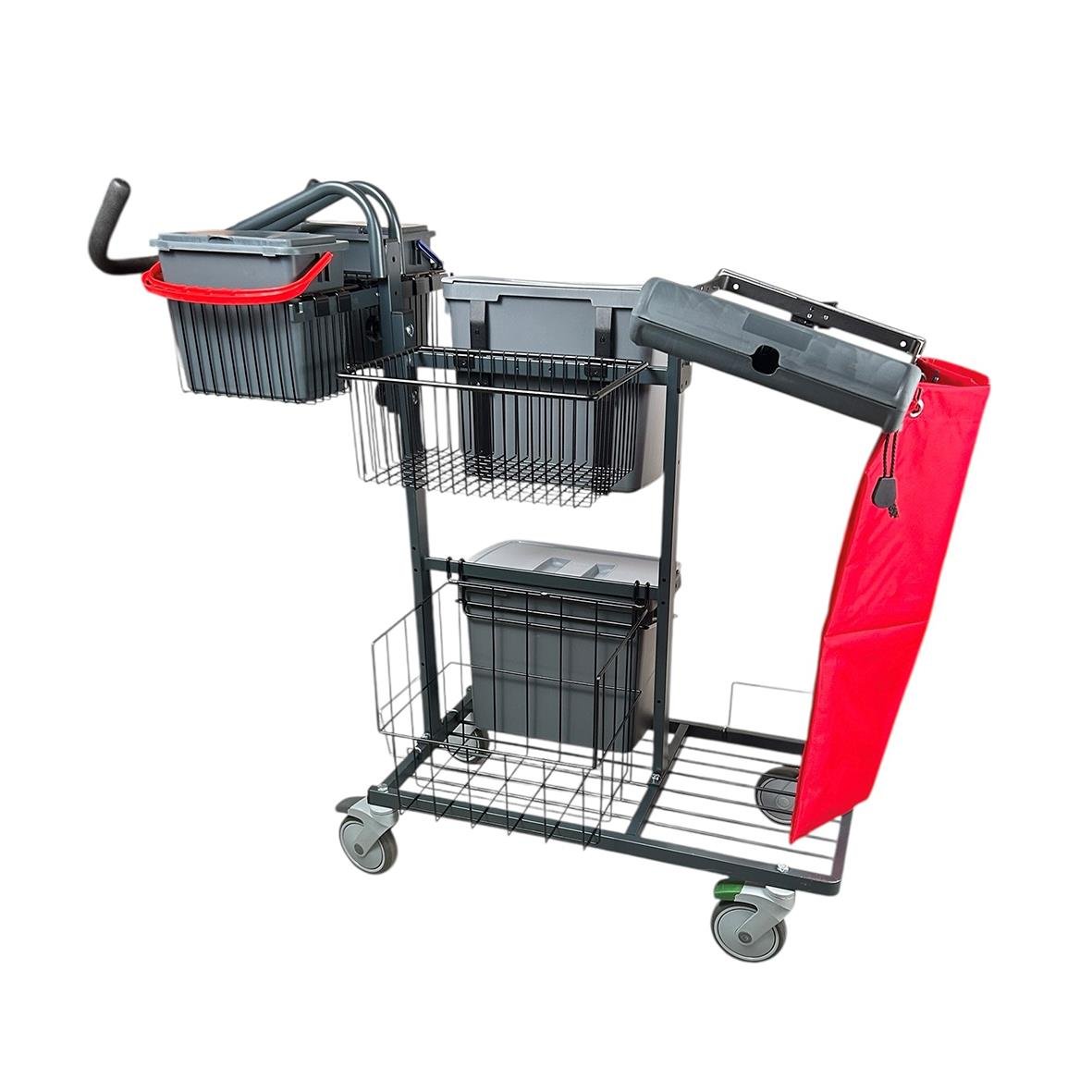 Städvagn Alloffice Maxi Gen2. Det här är en stor städvagn som har utrustats med anpassade funktioner för städning med impregnerat material. Vagnen har generöst med utrymme för påfyllningsmaterial, moppar och dukar. Användaren får bra ergonomi då vagnen ä