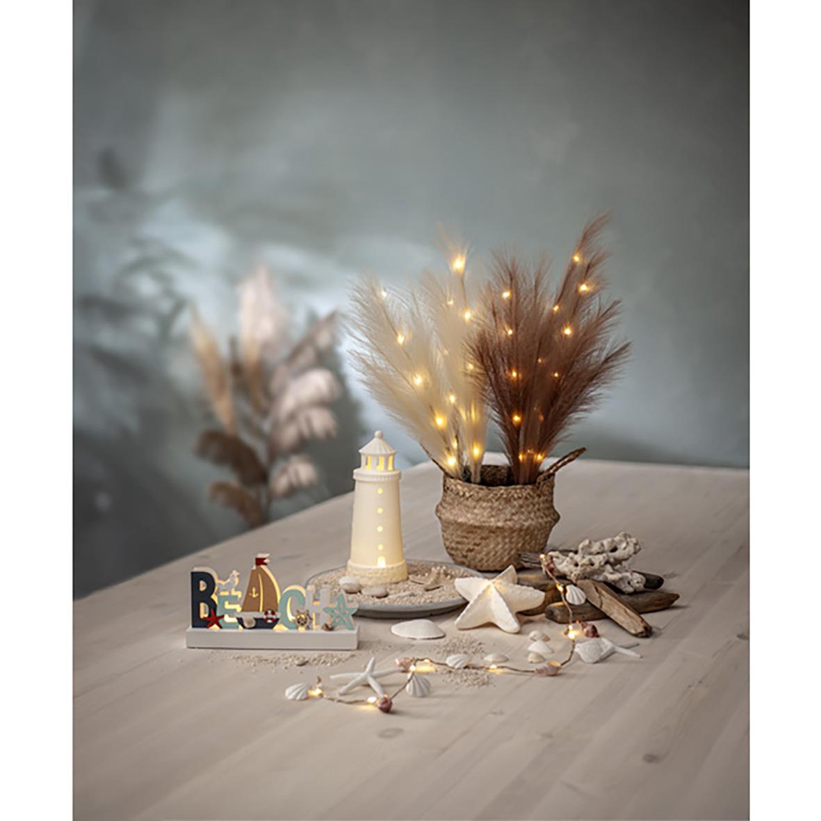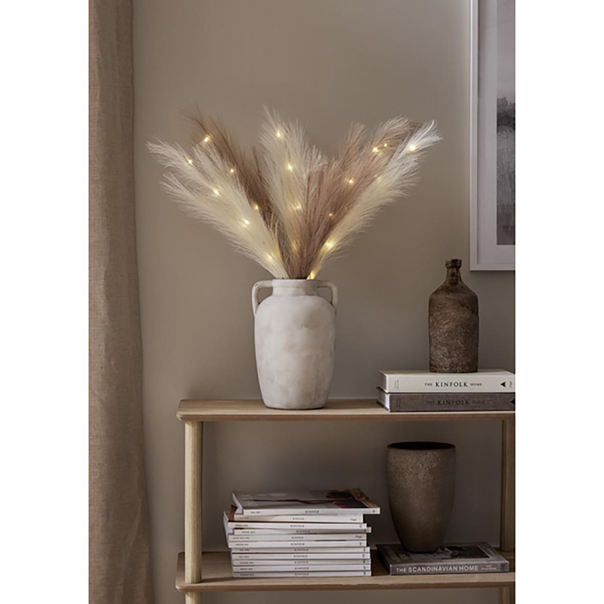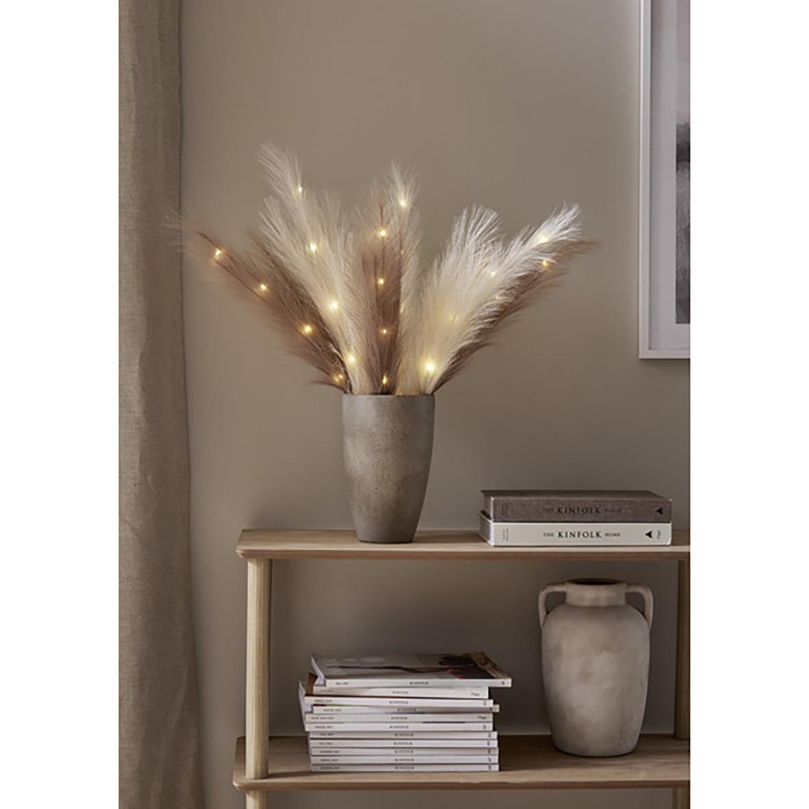 Dekorationskvist Plumes Ljus Beige. Batteridriven inomhusdekoration med konstgjorda större fjädrar i ljus beige. Timerfunktion 6h/18h. Kommer med tre kvistar monterade på en kabel, på varje kvist finns 5 varmvita LED för ett behagligt och stämningsfullt l