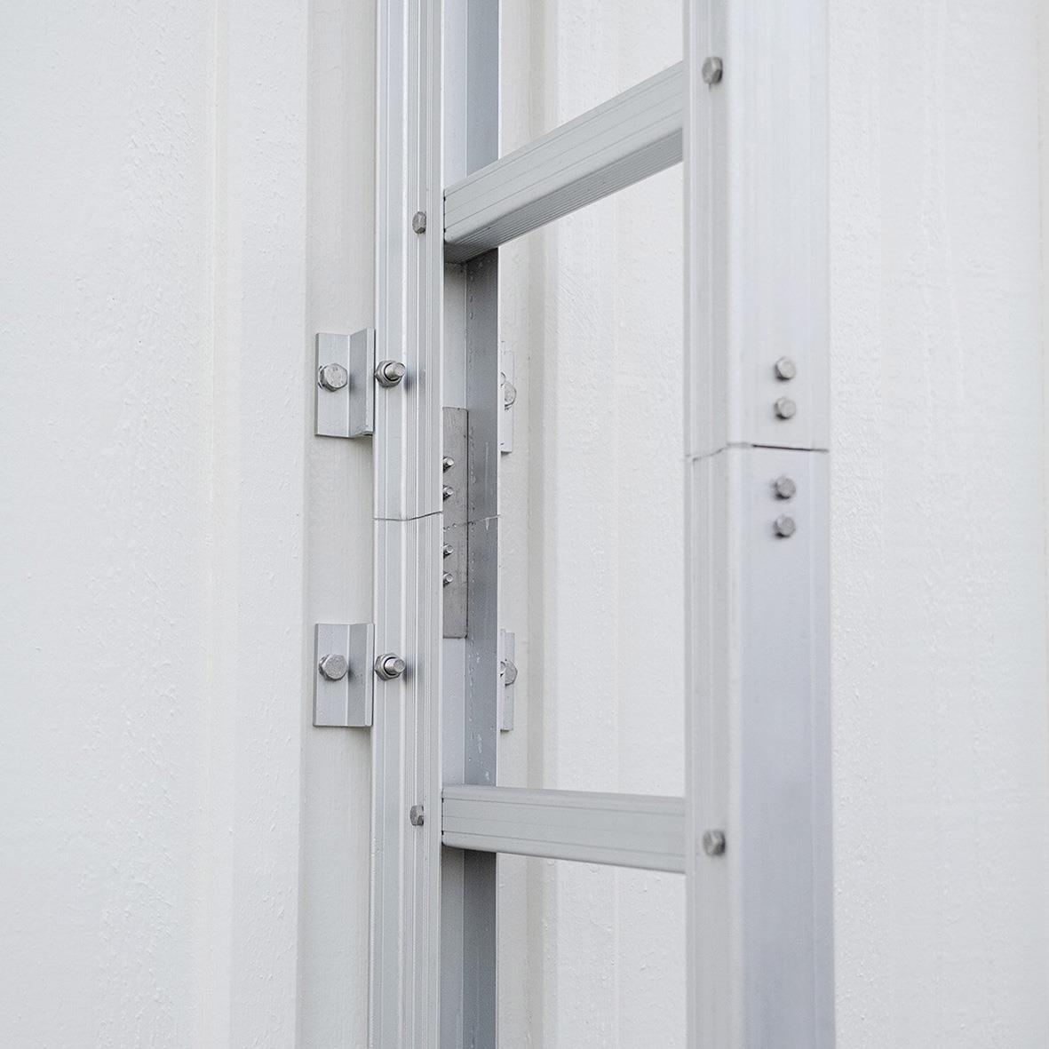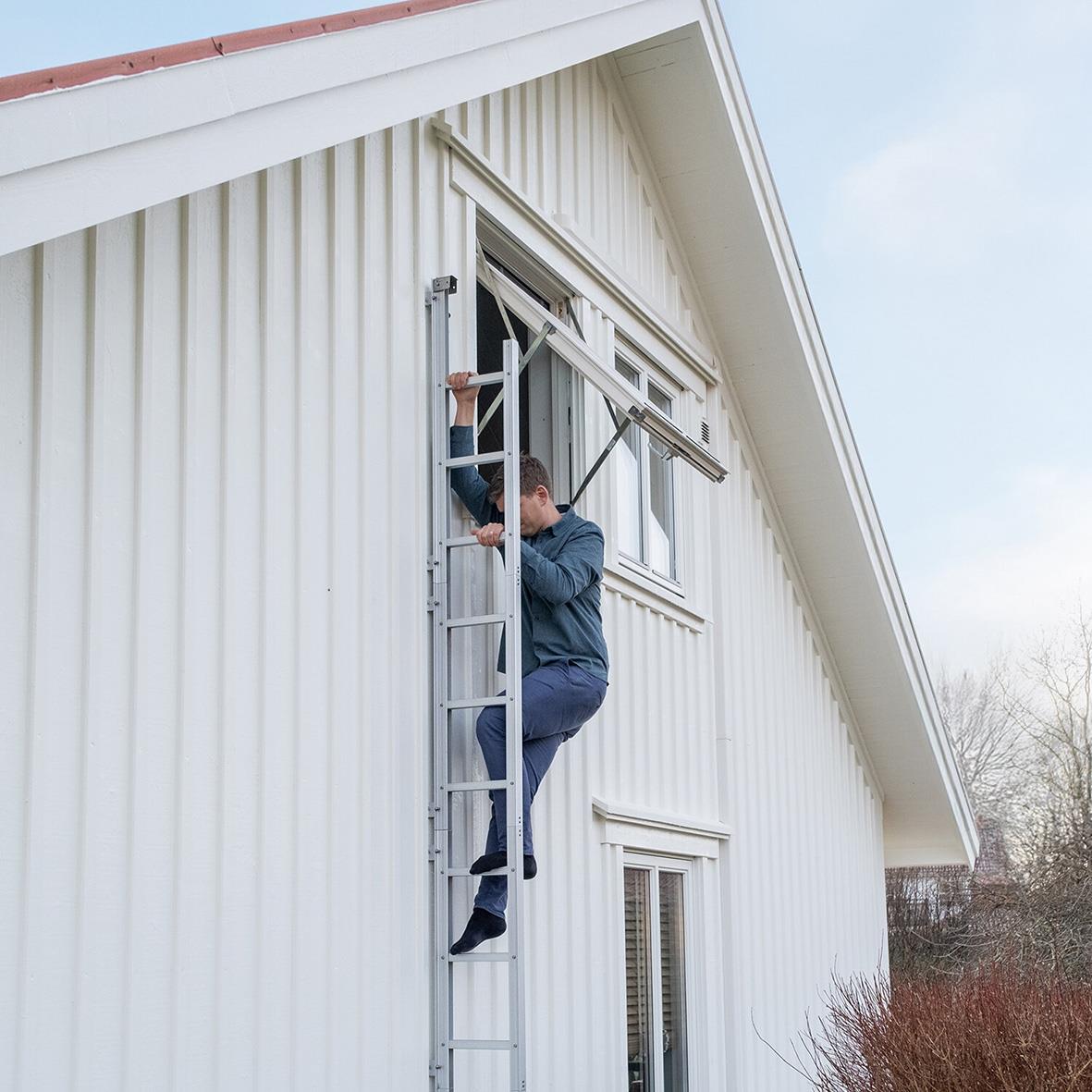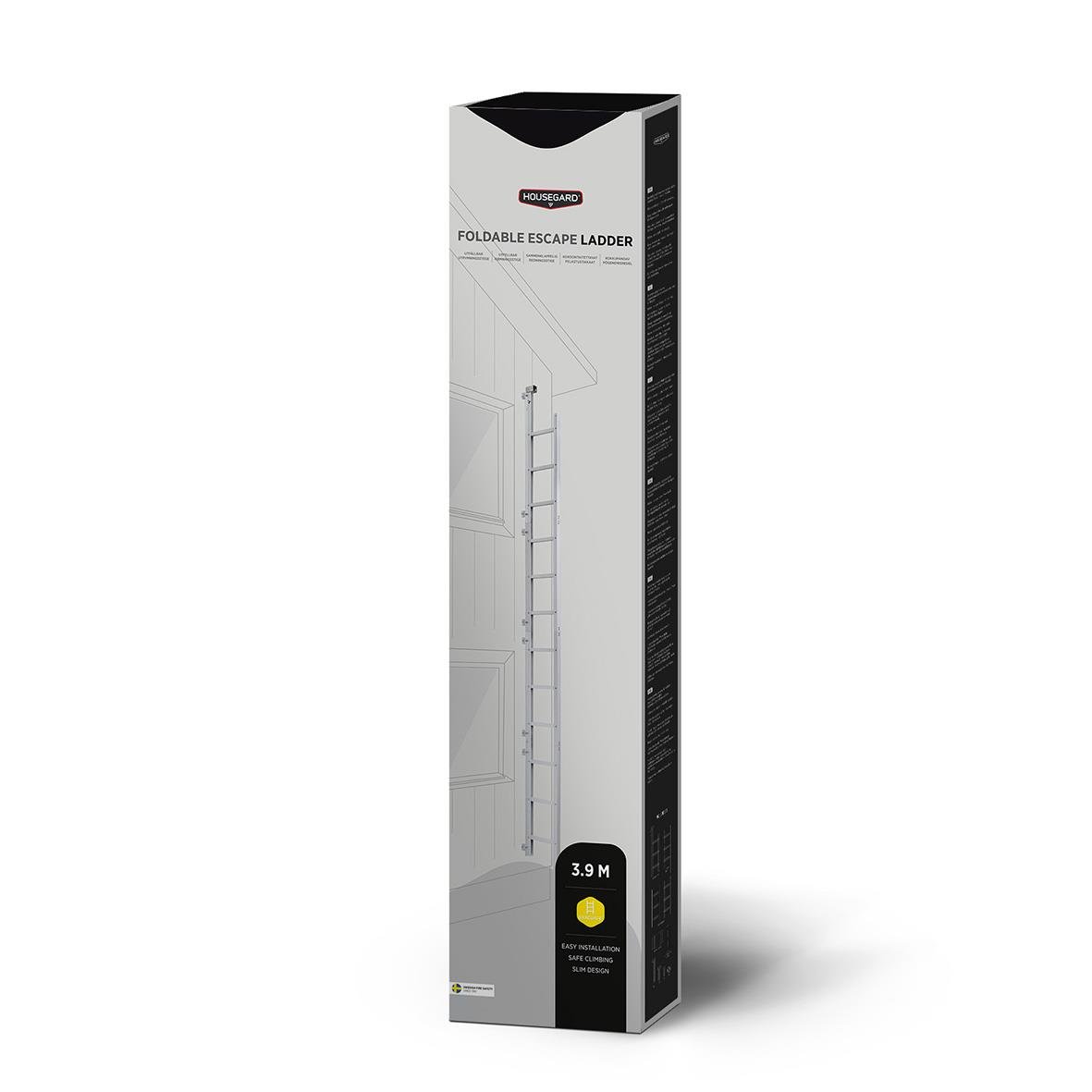 Utrymningsstege Housegard EL39 3,9 m. Housegards fasta utrymningsstege monteras direkt på fasaden och ger en säker och snabb utrymningsväg vid nödsituationer. Stegen är enkel att fälla ut med hjälp av en låssprint och är utformad för att vara stabil och h