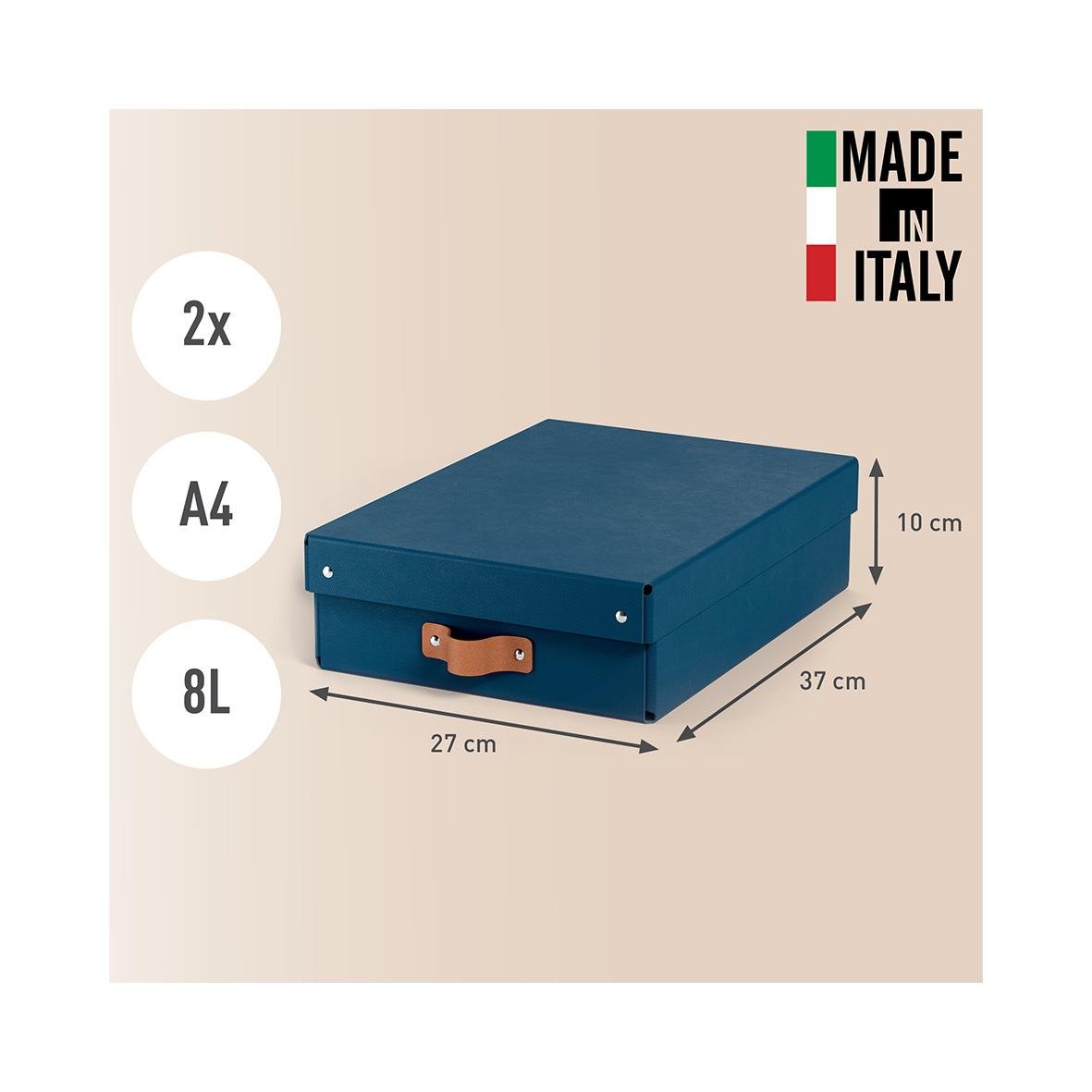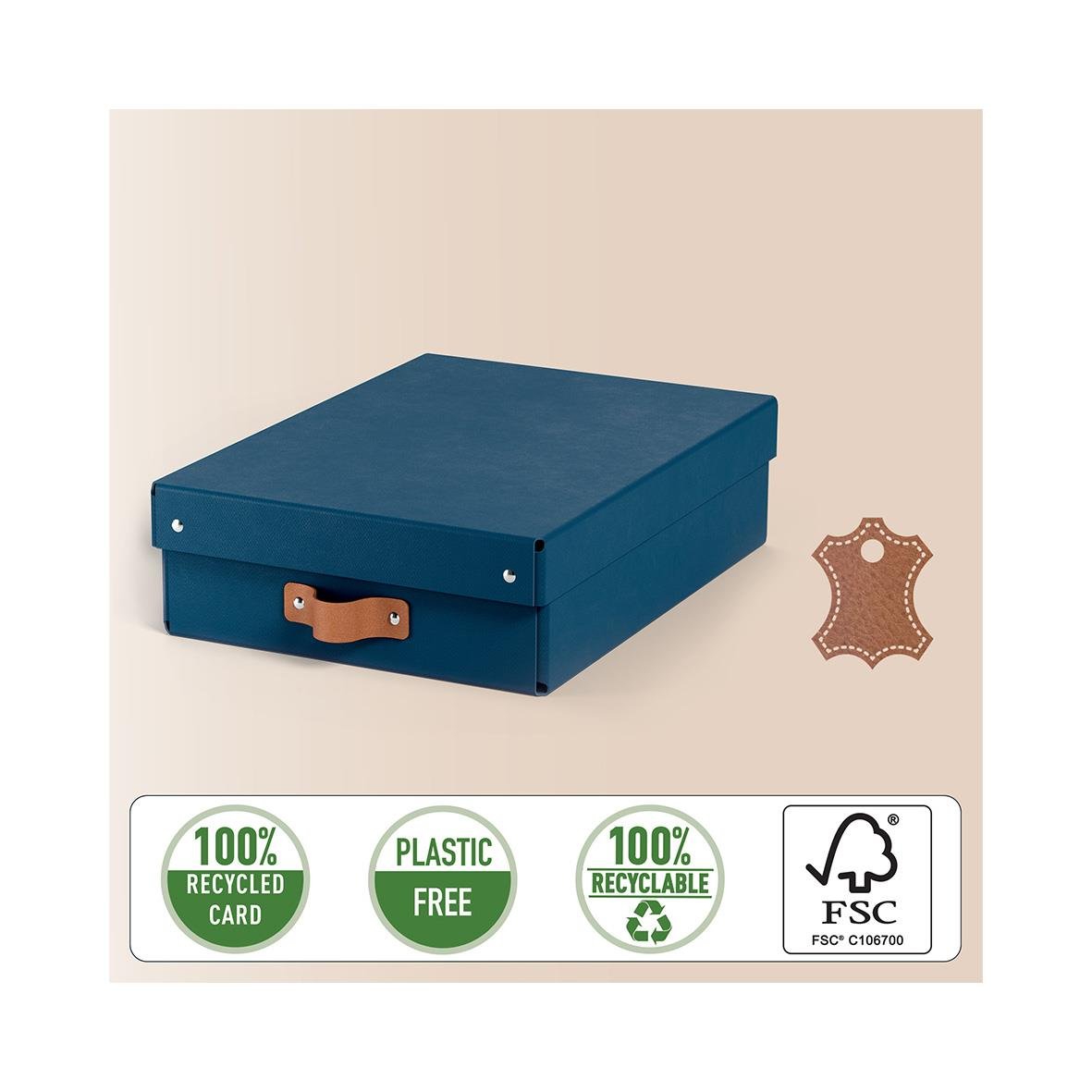 Set med två förvaringslådor i blått med låg höjd och lock tillverkade av 100% återvunnen FSC-certifierad kartong i en modern och stilren design som passar både hem och kontor. Mångsidig förvaring med en kapacitet på 8 liter, perfekt för A4-dokument, 14-tu