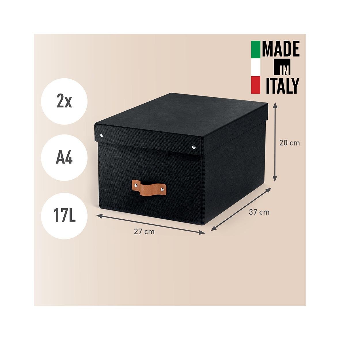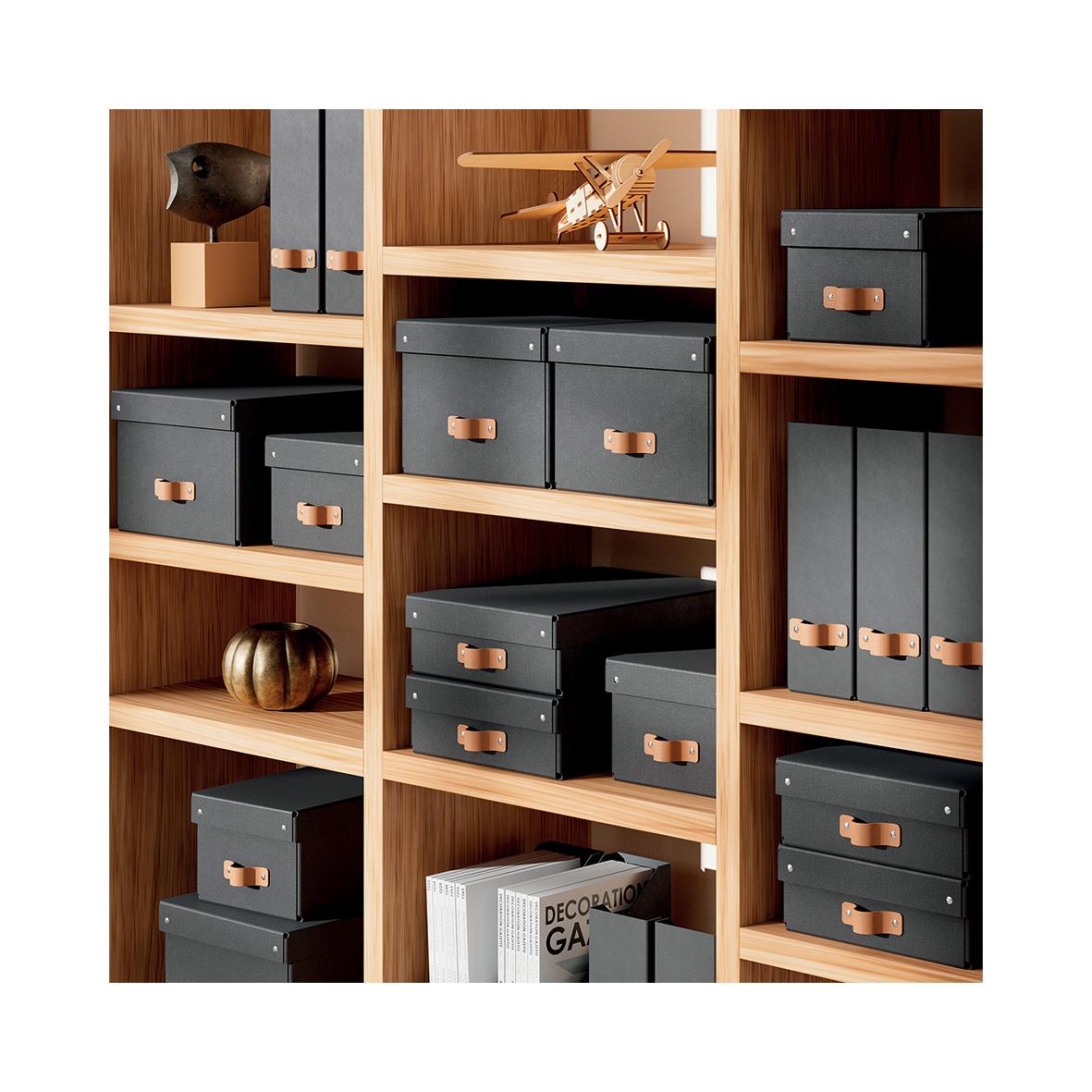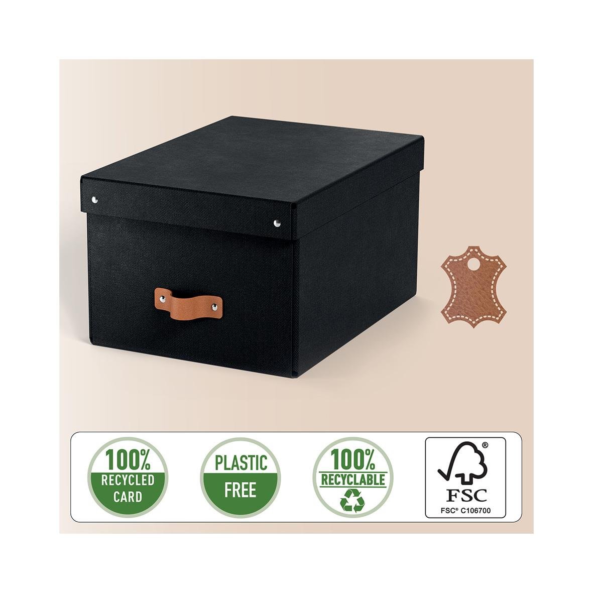 Set med två medelstora förvaringslådor i svart, med lock tillverkade av 100% återvunnen FSC-certifierad kartong i en modern och stilren design som passar perfekt för ditt hem och kontor. Mångsidig förvaring med en kapacitet på 17 liter, perfekt för A4-dok