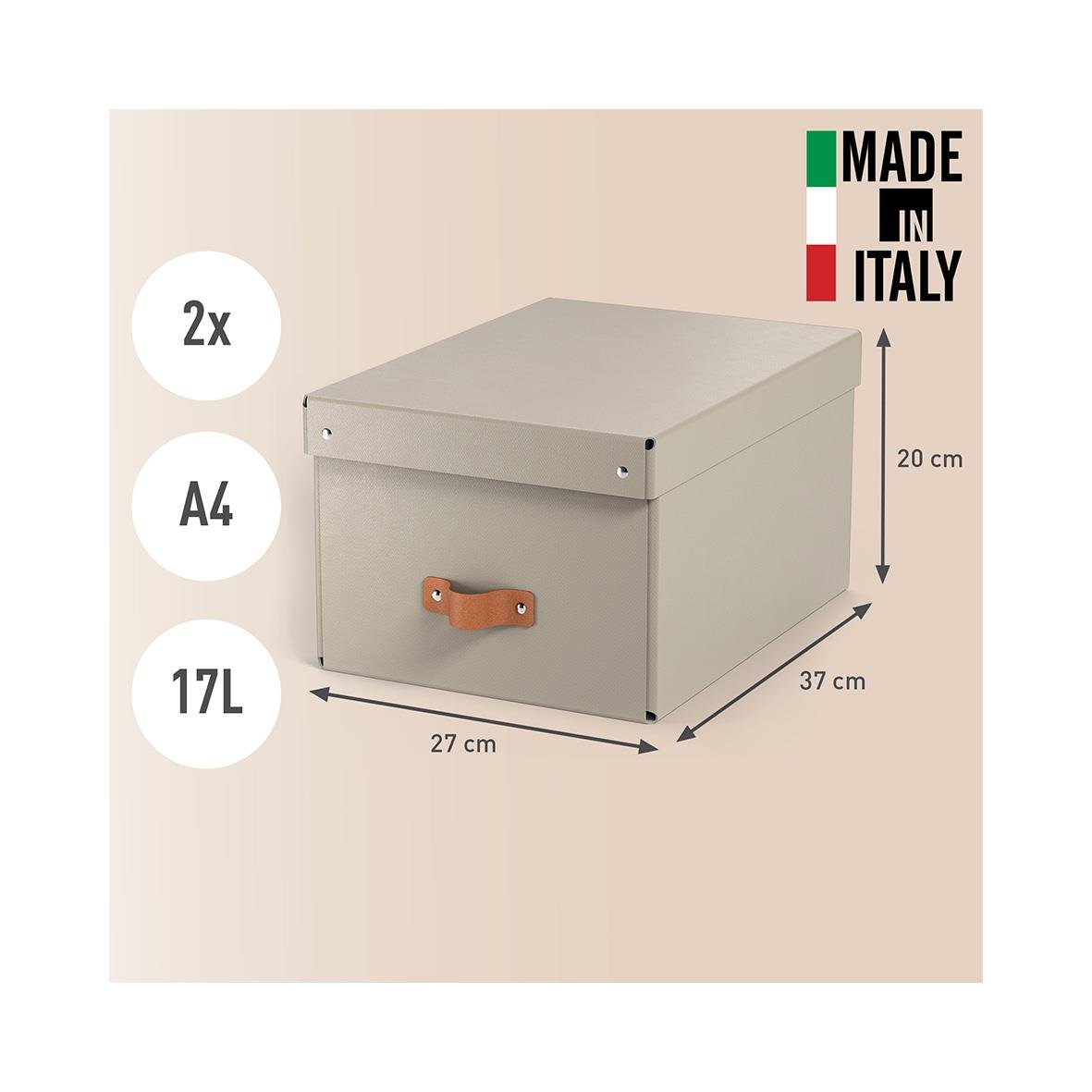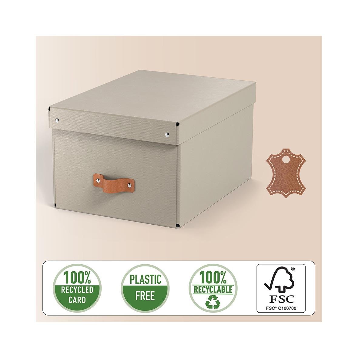Set med två medelstora förvaringslådor i beige, med lock tillverkade av 100% återvunnen FSC-certifierad kartong i en modern och stilren design som passar perfekt för ditt hem och kontor. Mångsidig förvaring med en kapacitet på 17 liter, perfekt för A4-dok