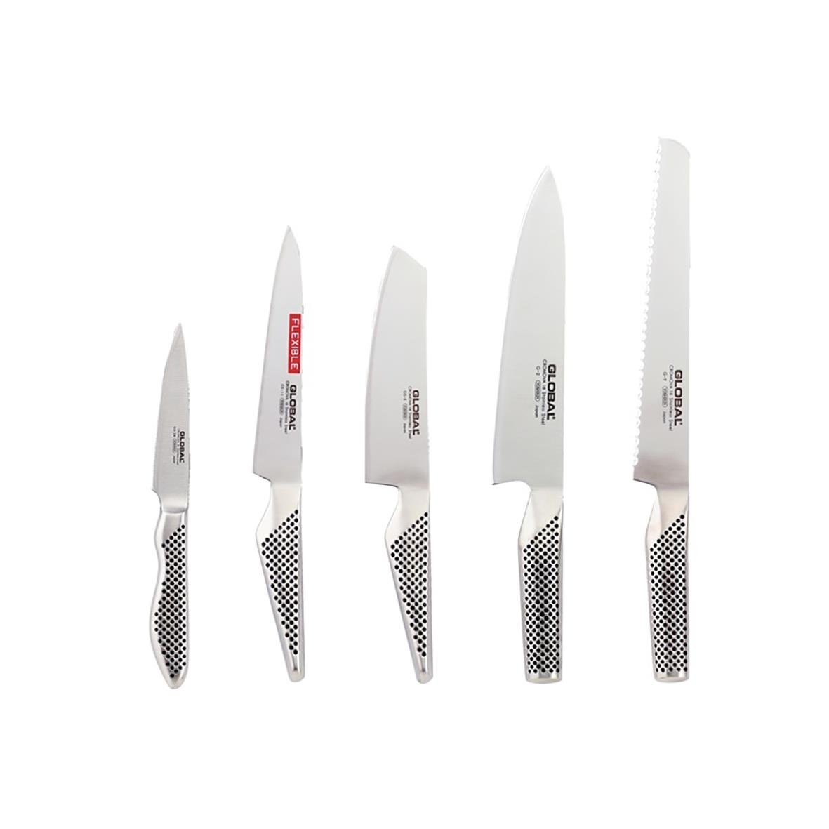 Med detta set är ditt kök fullutrustat. En kockkniv, en tandad brödkniv, en liten grönsakshacka, en liten flexibel kniv samt en liten skalkniv gör detta setet komplett! Material: Cromova 18-stål.