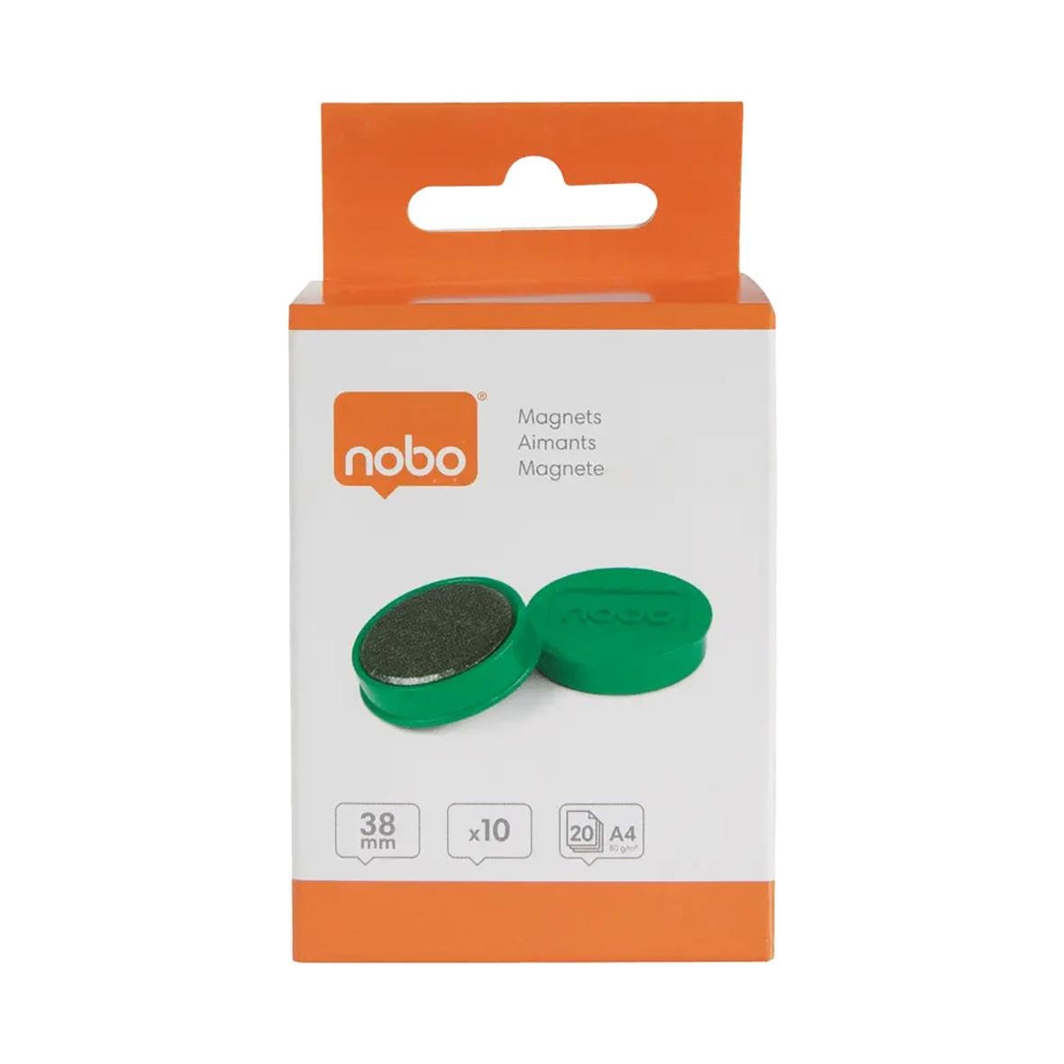 Magnet Nobo 38 mm Grön. Runda magneter är det perfekta verktyget för brainstorming-sessioner, när man vill visa och visualisera idéer på magnetiska whiteboards och glastavlor. De passar även utmärkt att använda som kylskåpsmagneter för att fästa påminnels