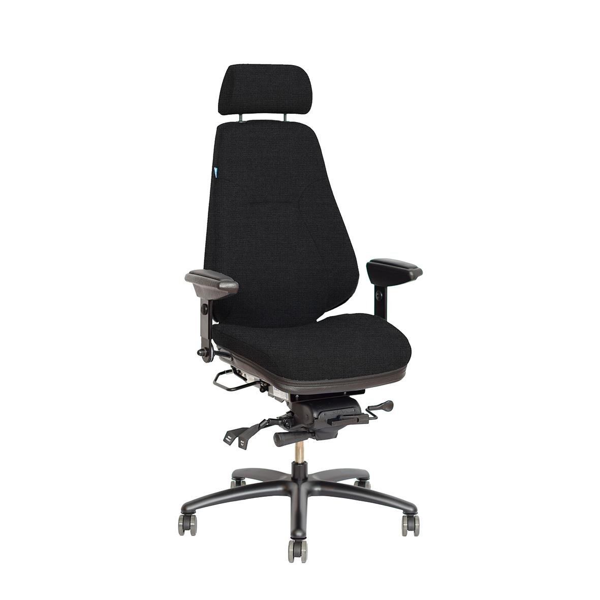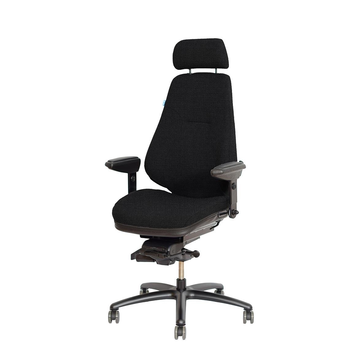 Kontorsstol Be-Ge Frapett 852 24H Tyg Svart. Extra kraftig 24H-modell med bred sits och hög rygg som ger komfort även under de längsta arbetspassen. Separat ryggvinkel och stötdämpad rygglutning gör att stolen följer dina rörelser för en aktiv och ergonom