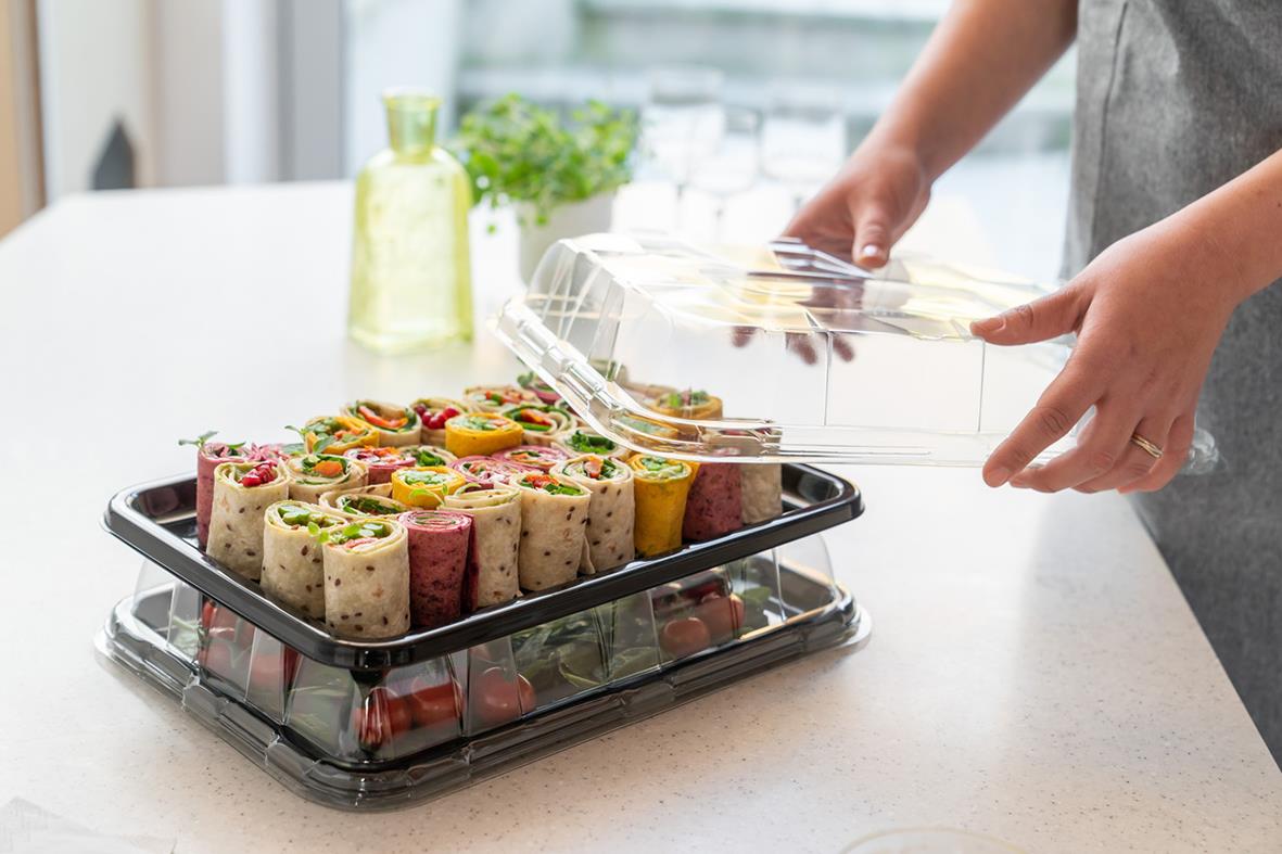 Uppläggningsfat Med Kupollock Svart 54x37x8 cm sampackat med kupollock. Mått inkl lock 54x37x8 cm. Tillverkat av återvunnen plast ( rPet). Snyggt och praktiskt uppläggningsfat som passar perfekt för catering och uppläggningar av en mängd olika produkter.
