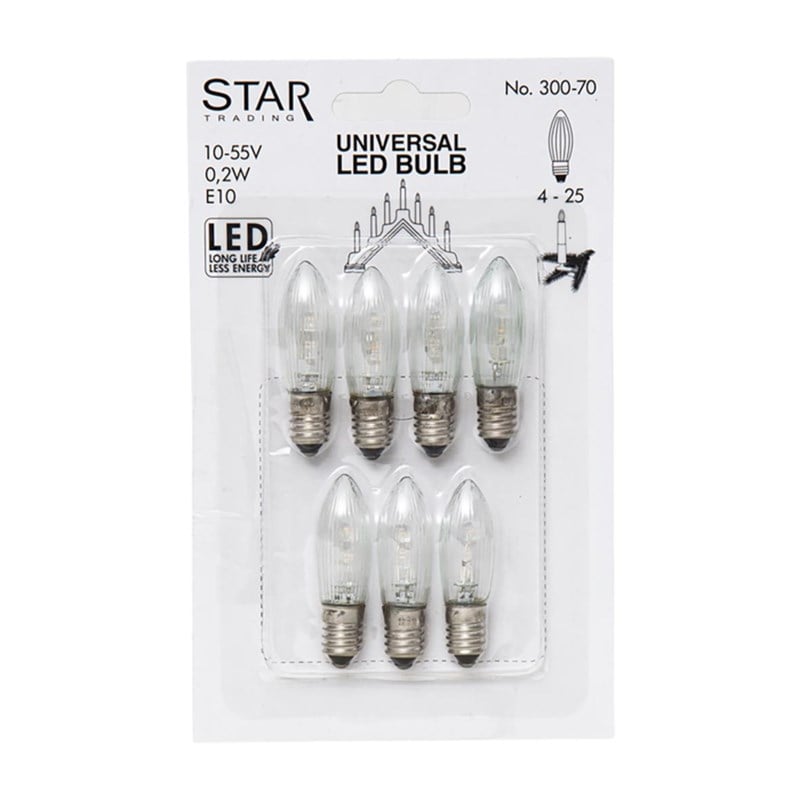 Reservlampa Universal LED 0,2W Varmvit Klar. 7-pack reservlampor Universal LED. Lamporna har klart glas och E10 sockel, 10-55V. Denna produkt passar till ljusstakar med 4-25 lampor och stickkontakt. För inomhusbruk.