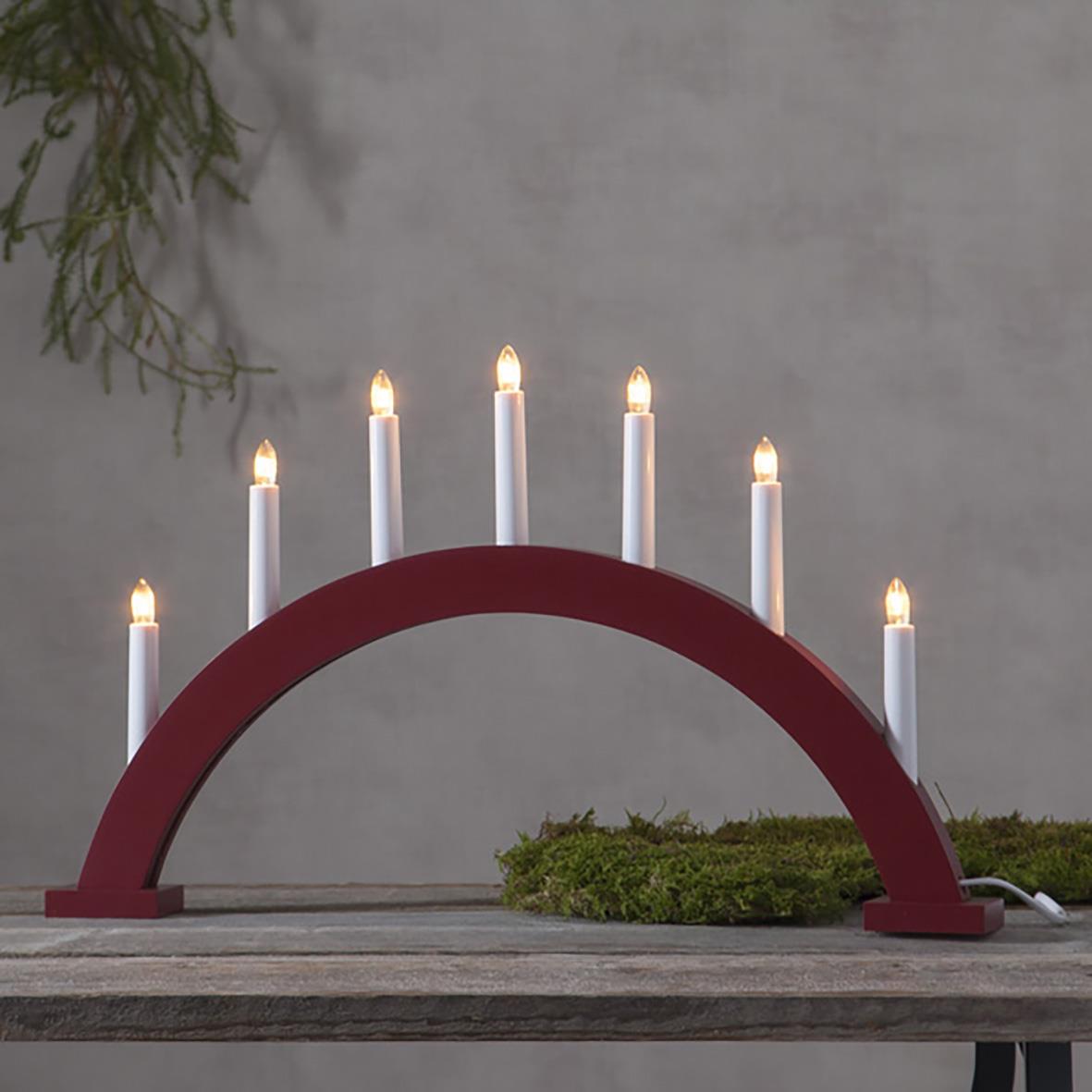 Röd bågformad träljusstake, 7 ljus. Placera ljusstaken exempelvis i förnstret för att skapa en härlig adventsstämning i hemmet. 1,8 m sladd. Bredd: 57 cm, höjd: 34 cm.