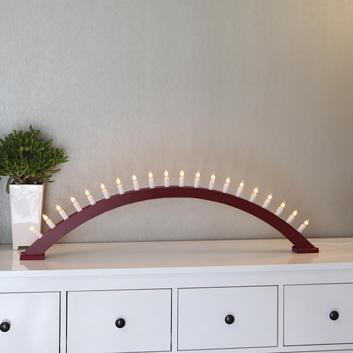 Röd träljusstake med 20 ljuskällor. Ljusstaken är formad som en båge och ger ett elegant intryck i rummet. En underbar adventsljusstake som sprider härlig julstämning i hemmet.