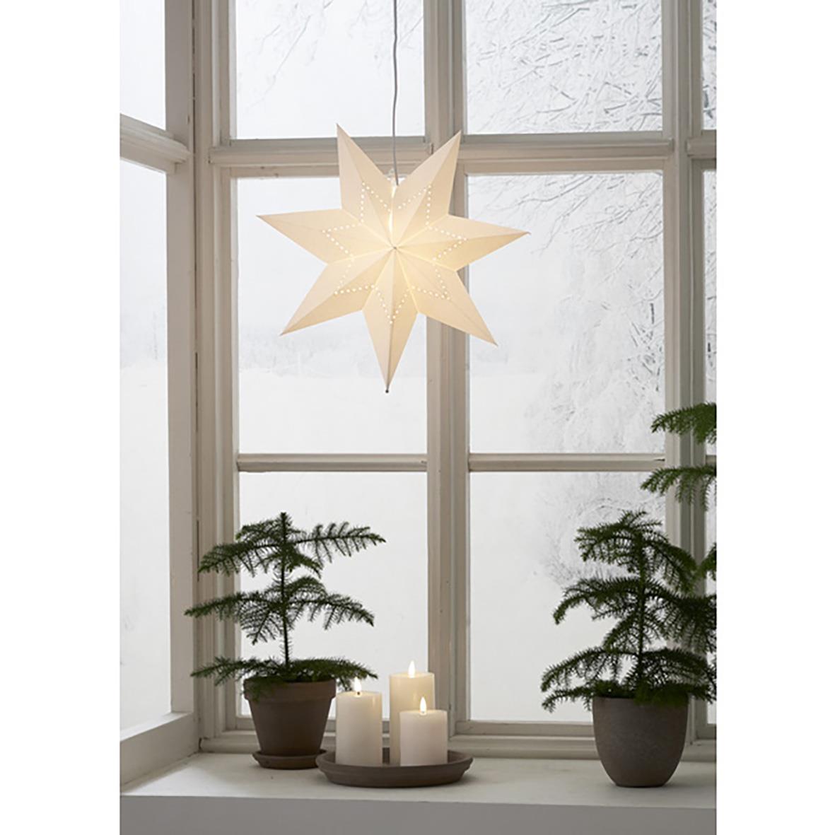 Vit pappersstjärna med hålmönster i form av en stjärna. Dekorera med till jul och advent. Häng en eller flera stjärnor tillsammans i ett fönster eller mot en vägg. Stjärnan har plats för en ljuskälla och det följer med ett upphäng för E14 lampa.