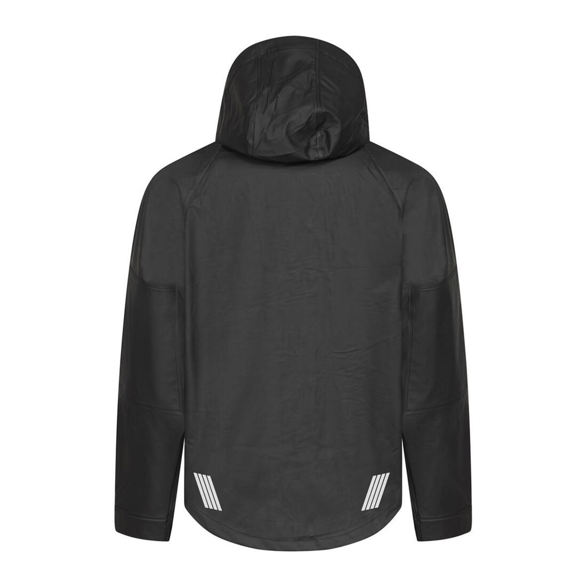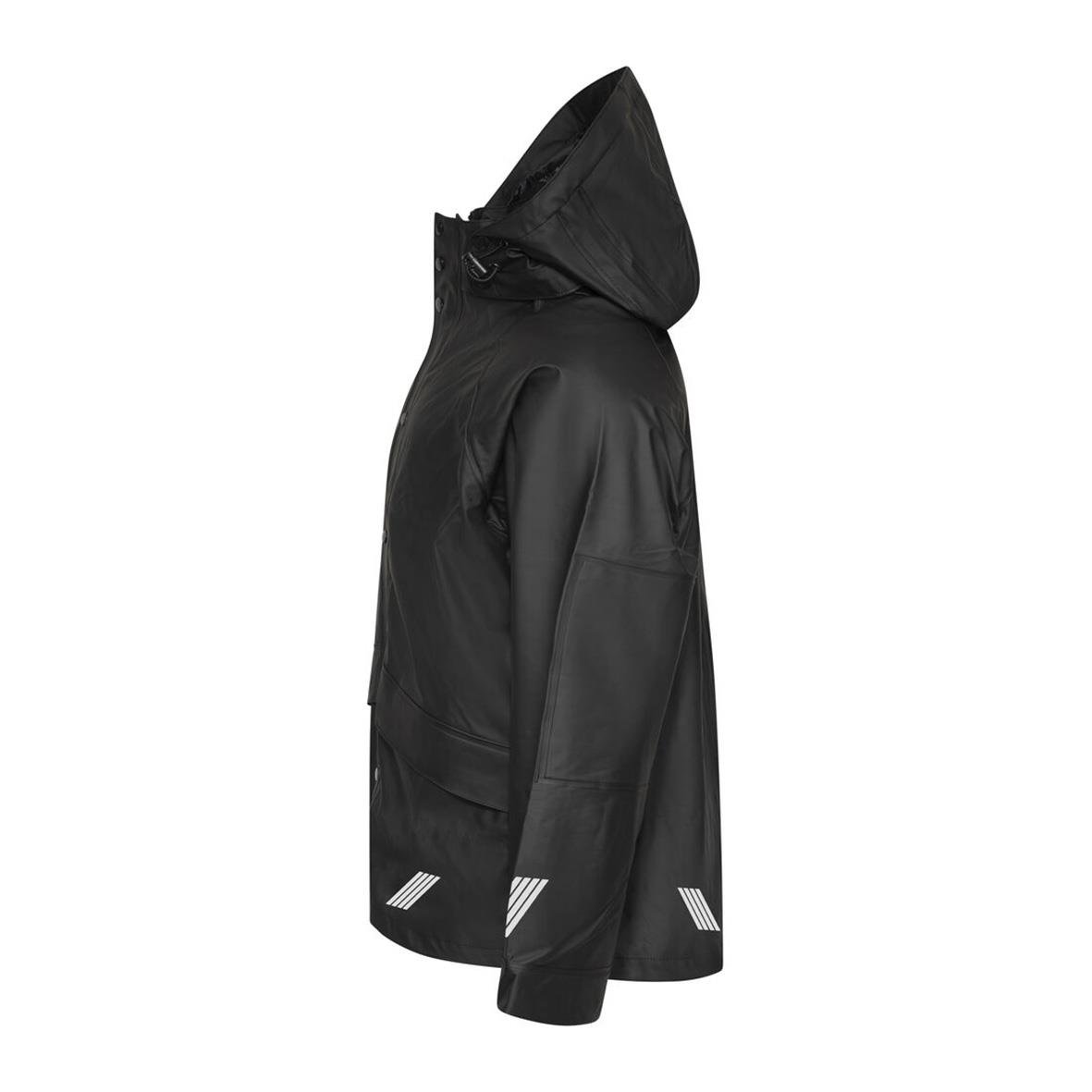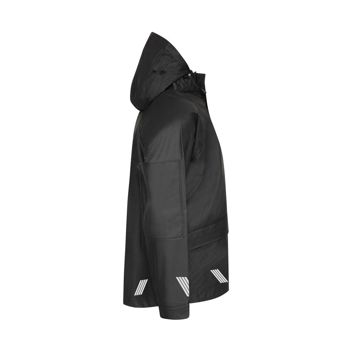 Regnjacka Projob 4430 Svart 3XL Regnjacka med tryckknappar samt dragkedja framtill. Sydda och svetsade sömmar. Reglerbara ärmslut med tryckknappar. Reglerbar huva. Re?exdetalj i nederkant av jackan på fram- och baksida, även på ärmarna. Material - 58% P