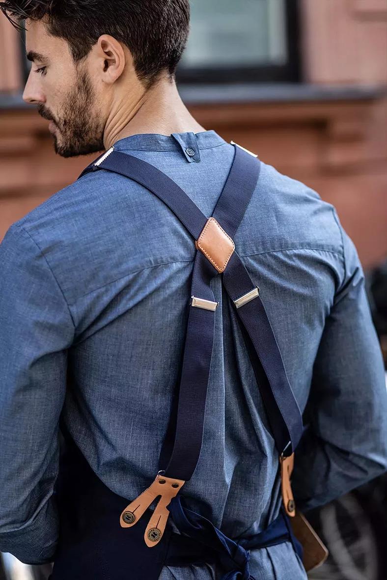 Resårhängsle Segers 0568 Marin L/XL. Justerbara resårhängslen. S/M (ca 54-80 cm), L/XL (ca 68-108 cm). Passar förkläde 4078 - Resår/ Läder - Hängslen som fästs med skinntoppar och metallknappar - Plockas ur vid tvätt - Resår-kvalitet