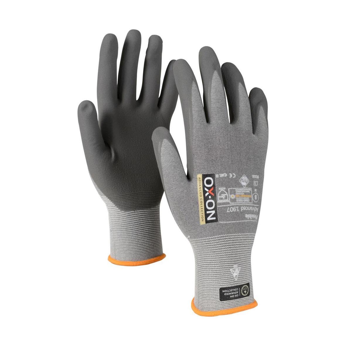 Montagehandske OX-ON 1907 Flexible Advanced 9 OX-ON Flexible Advanced 1907 är den tunnaste handsken i klassen, men fortfarande av högsta kvalitet och även ESD-godkänd och med touch-funktion. Handsken är extremt slitstark och sitter som gjuten på handen.