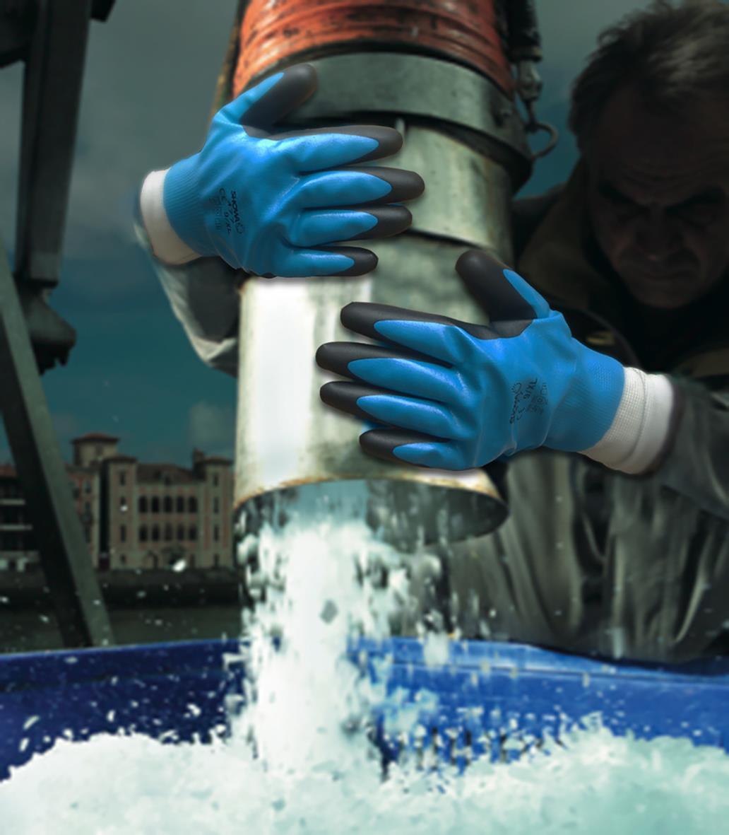 Handske Showa 477 Nitril Winter Svart/Blå 9. För användare som önskar hålla sina händer torra och varma i kall och blöt omgivning är Showa 477 det självklara valet. En bra kombination av varmt akrylfoder och ett yttermaterial som är tätt mot både vatten