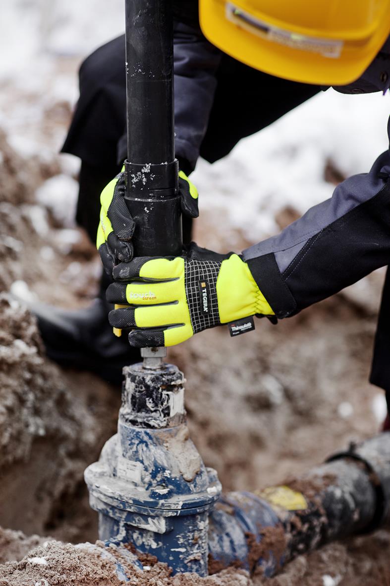 Läderhandske Tegera 9128 10. Ergonomisk, vattentät handske i Microthan+® med touchscreen-funktion. Thinsulate™ och invändig fleece håller kvar kroppsvärmen. Slitstarkt Microthan®+ syntetläder. Bra grepp på hala ytor tack vare diamant greppmönster. Ovan