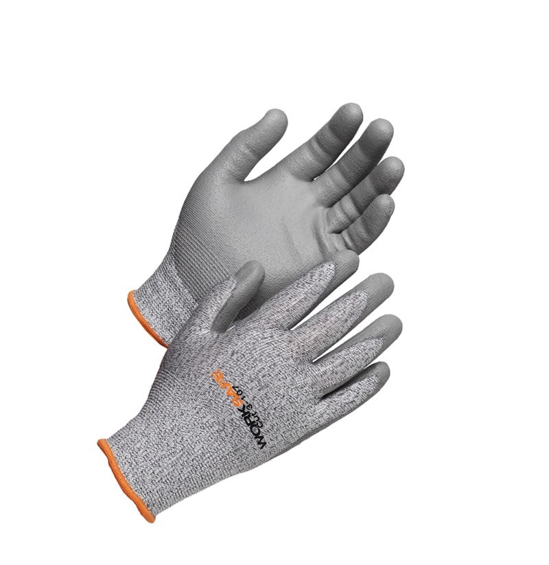 Skärskyddshandske Worksafe Cut-107 stl 8. Bekväm PU-doppad skärskyddshandske med skärskyddsnivå 3. Passar bra till arbete där skärskador kan förekomma. Ventilerande ovanhand och en stickad sömlös liner ger en skön komfort under hela arbetspasset. Lämplig