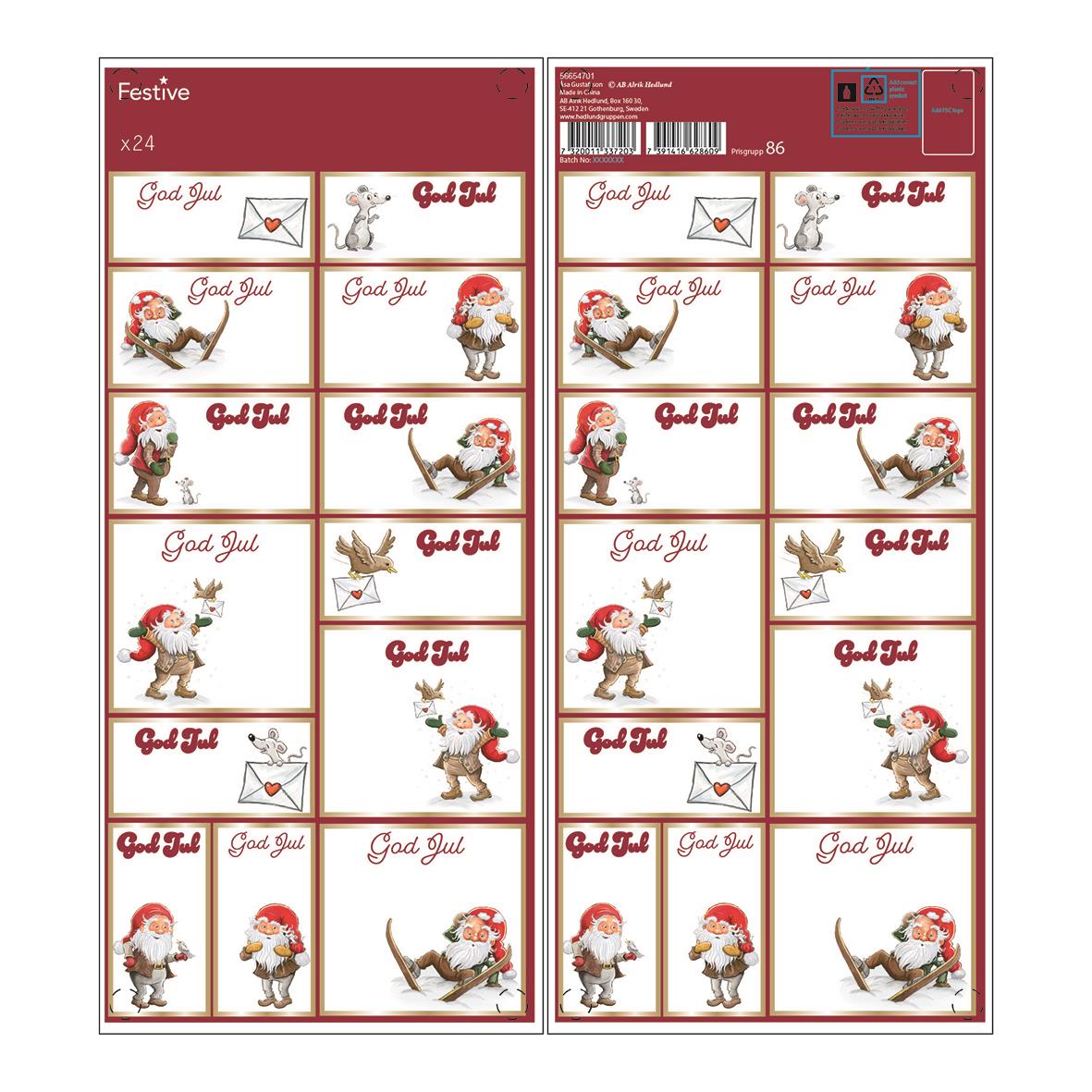 Juletiketter Ark med olika motiv och storlekar. Självhäftande etiketter med julmotov, 24 st / förpackning, blandade storlekar.