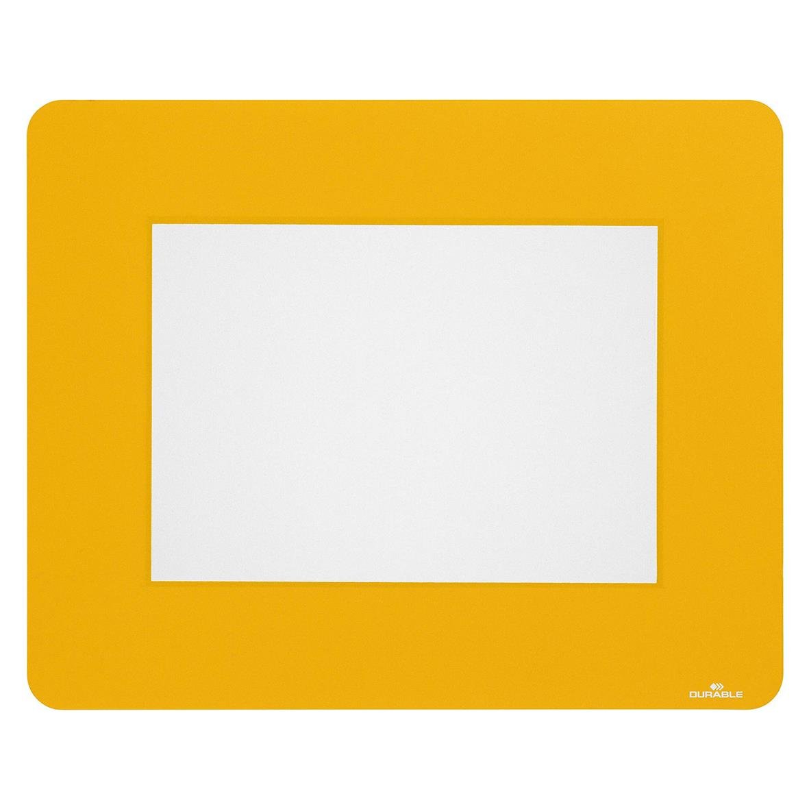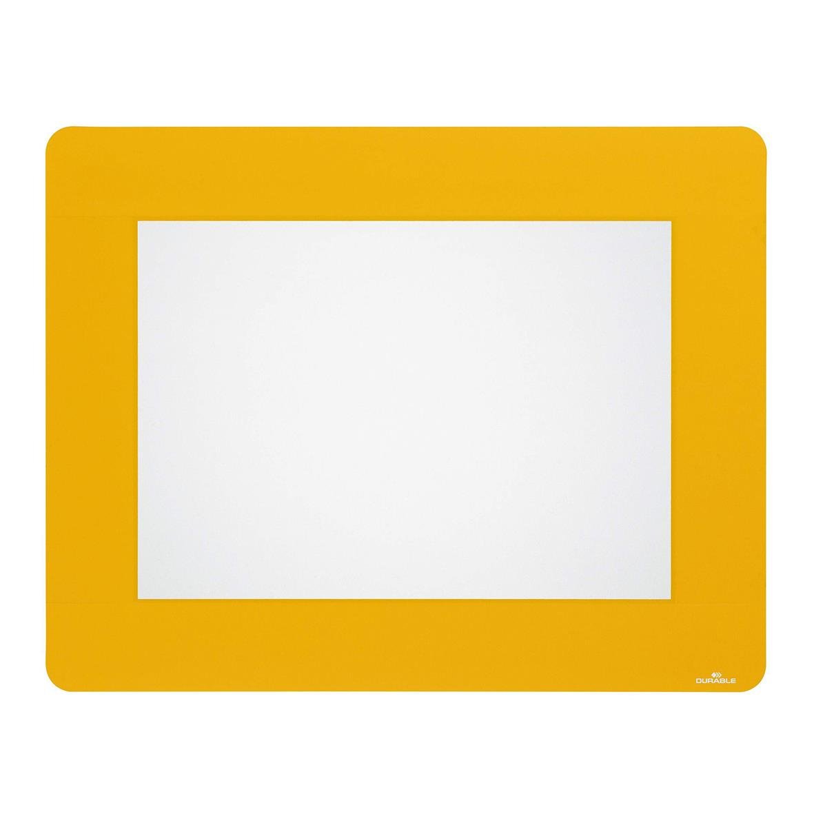 Självhäftande, borttagbar golvdekal med genomskinligt fönster och gul ram för A5 dokument. För tillfällig information i affärer, på gym, hotell och restauranger. Den självhäftande tejpen på ramens baksida fäster på rena och torra betonggolv. Lägg A5 inlag