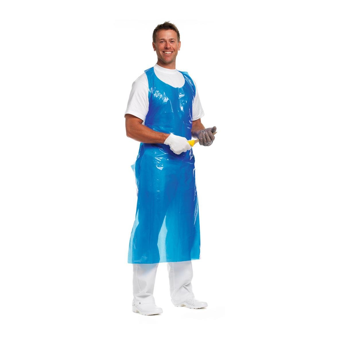 Förkläde av polyeten. Tåligt förkläde som skyddar mot vatten, smuts och lättare rengöringsmedel. Lämplig för livsmedels- och läkemedelsindustri.
