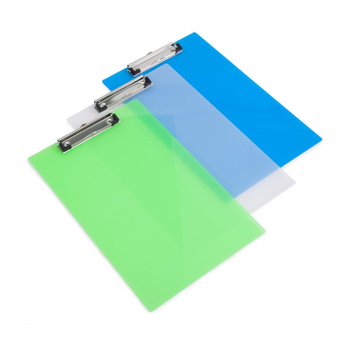 Skrivplatta Plast Sorterade färger A4. Praktisk skrivplatta i A4-storlek med stark fjäderklämma som håller dokument säkert. Rymmer upp till 100 ark (80 g/m²) och har låg profil som gör den enkel att stapla. Skyddande plastkanter ger bra grepp utan att ska